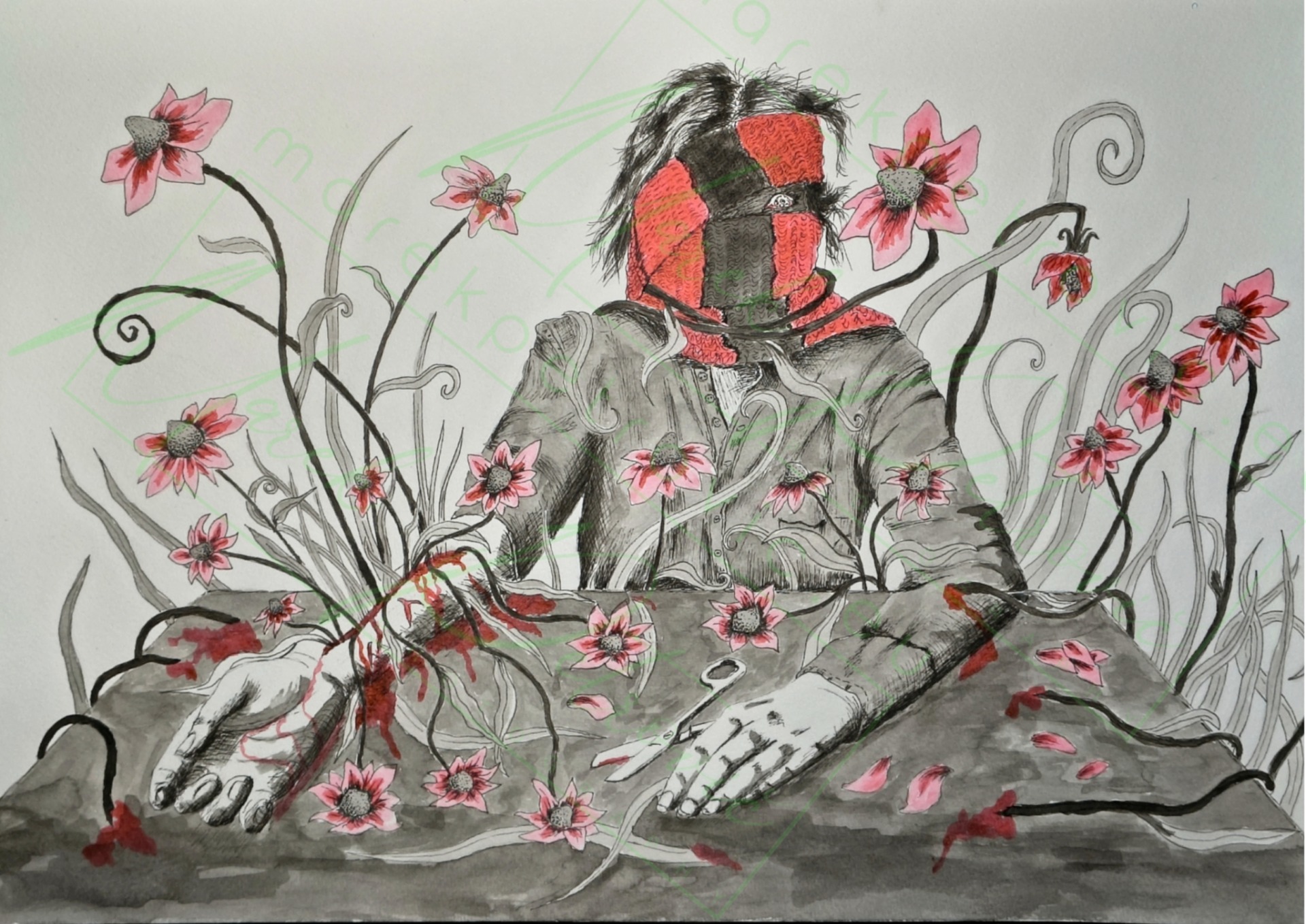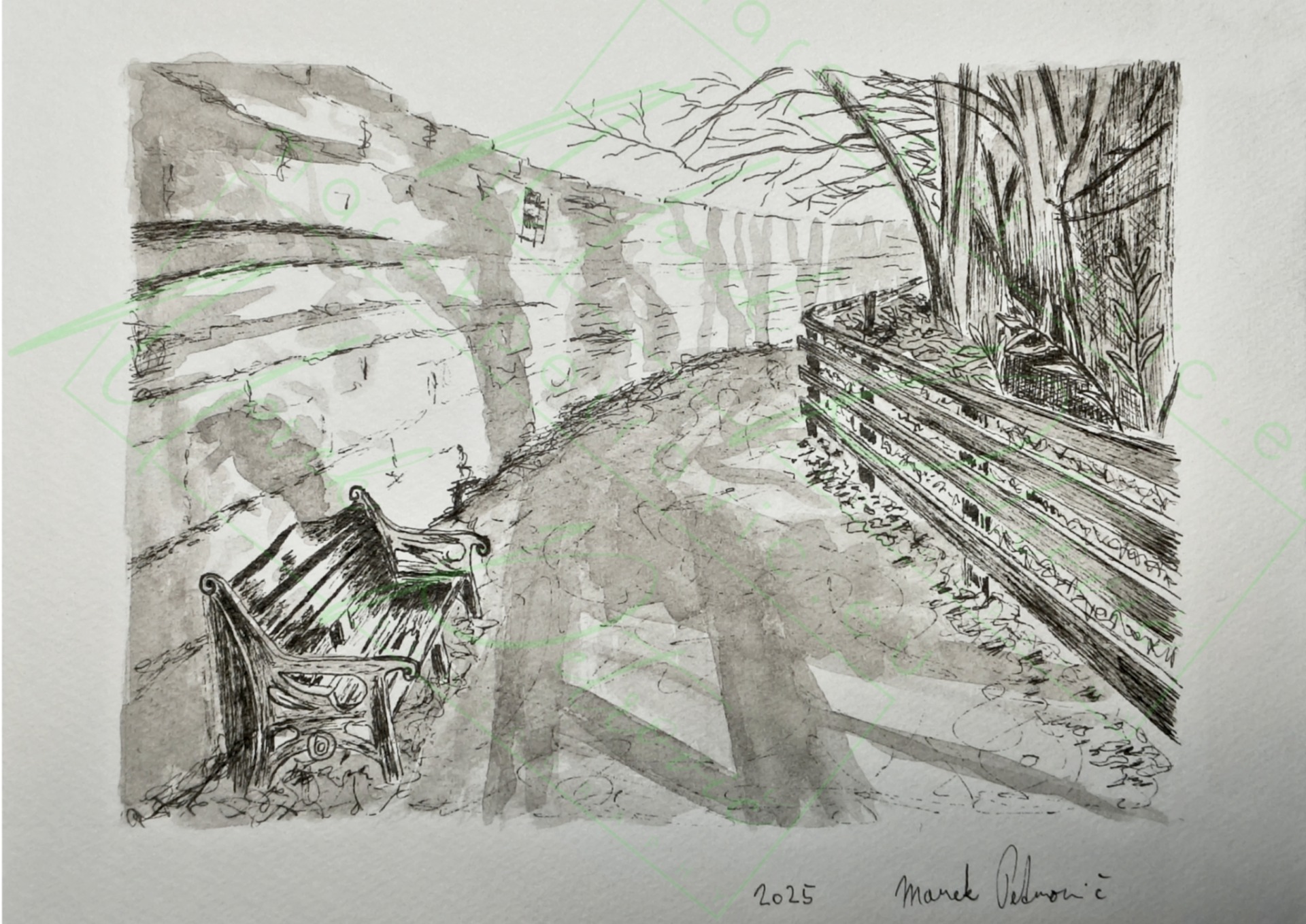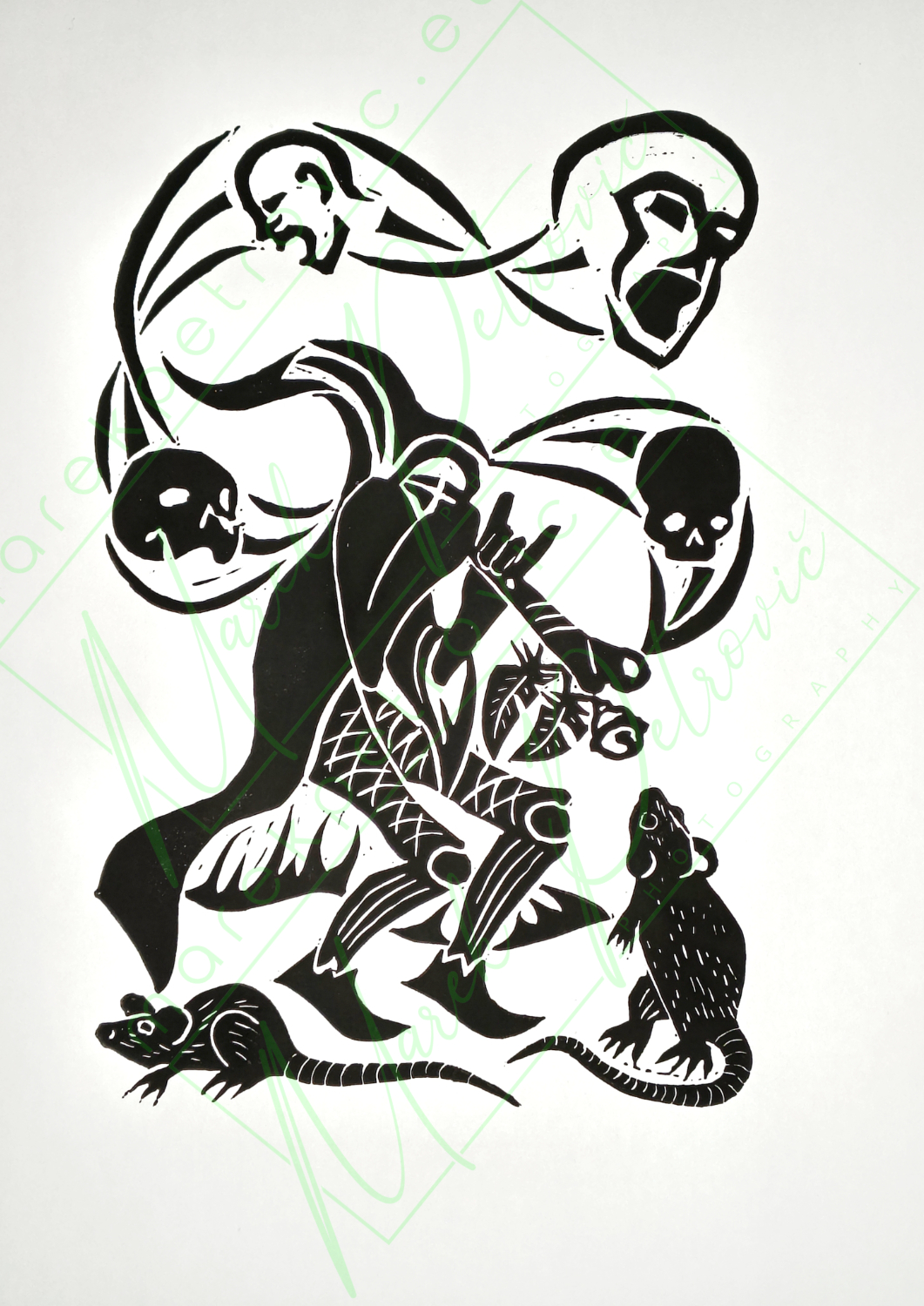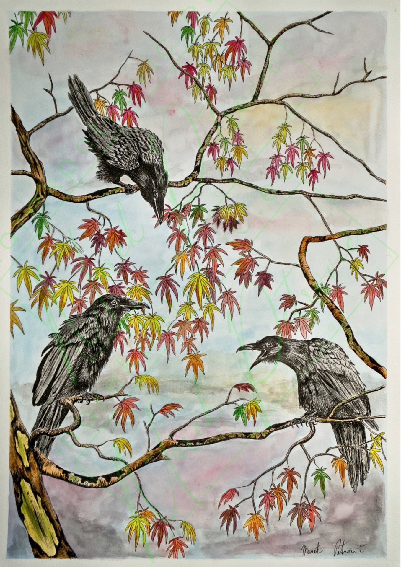 I primarily work in ink on watercolor paper, and I also paint with acrylic and oil on canvas. In addition, I create linocut prints. A selection of my paintings is available for purchase in my shop.
